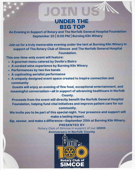 Join us for a truly memorable evening under the tent at Burning Kiln Winery In support of The Rotary Club of Simcoe and The Norfolk General Hospital Foundation.