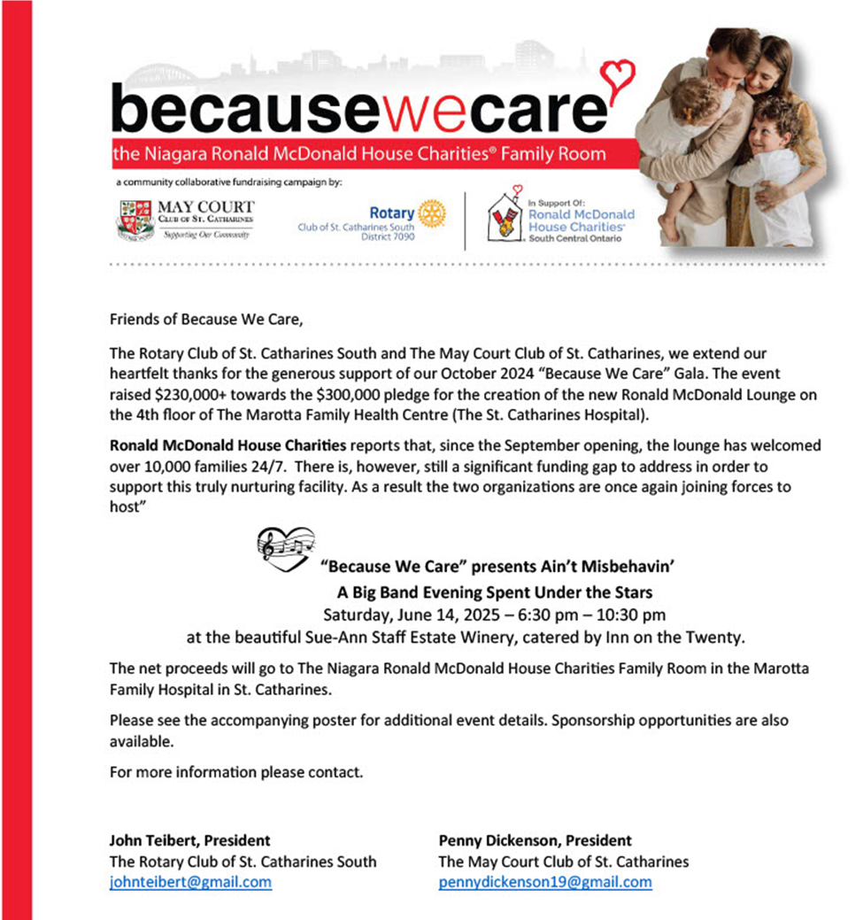 The Rotary Club of St. Catharines South and The May Court Club of St. Catharines extend our heartfelt thanks for the generous support of our October 2024 “Because We Care” Gala. The event raised $230,000+ towards the $300,000 pledge for the creation of the new Ronald McDonald Lounge on the 4th floor of The Marotta Family Health Centre (The St. Catharines Hospital).