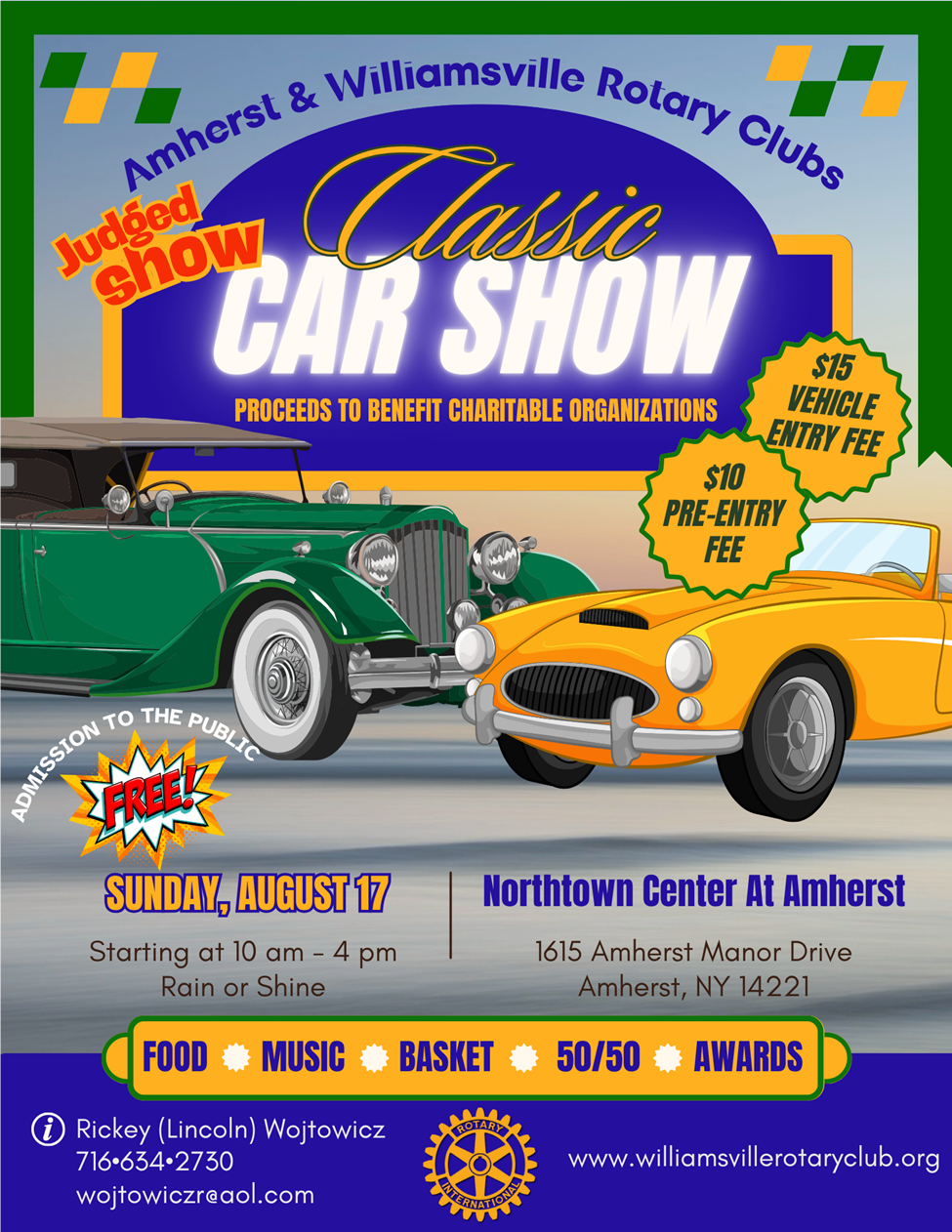 The Williamsville Rotary Club, in collaboration with the Amherst Rotary Club, is pleased to announce the 2025 Classic Car Show and Family Fun Day.