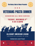 The Olean Rotary Club will host its annual Veterans Recognition Pasta Dinner from 4:30 to 6:30 p.m. on Tuesday, Nov. 4, at the Allegany American Legion Charles Harbel Post 892, located at 4350 Route 417, Allegany.