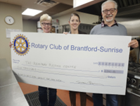 Brantford Sunrise, supported by a 7090 District grant of $2,000 US, has donated $6,000 toward the purchase of a commercial double convection oven for the Brantford Blessing Centre. Representative Jennifer Barker is seen accepting the cheque from Club President Susan Brown, and Sunrise Grant Committee Chair Glen Christensen.