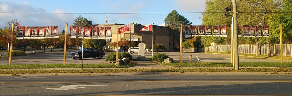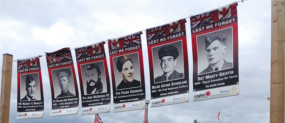 In support of the Royal Canadian Legion Branch 551 (Waterdown Legion) the Rotary Club of Flamborough AM had six posts installed to display banners of local veterans. The project was completed earlier in the summer and is now being used in its first Remembrance Day display. The banners flank the cenotaph, welcoming all who come to pay their respects. Banners will also be displayed on other historically significant dates throughout the year.